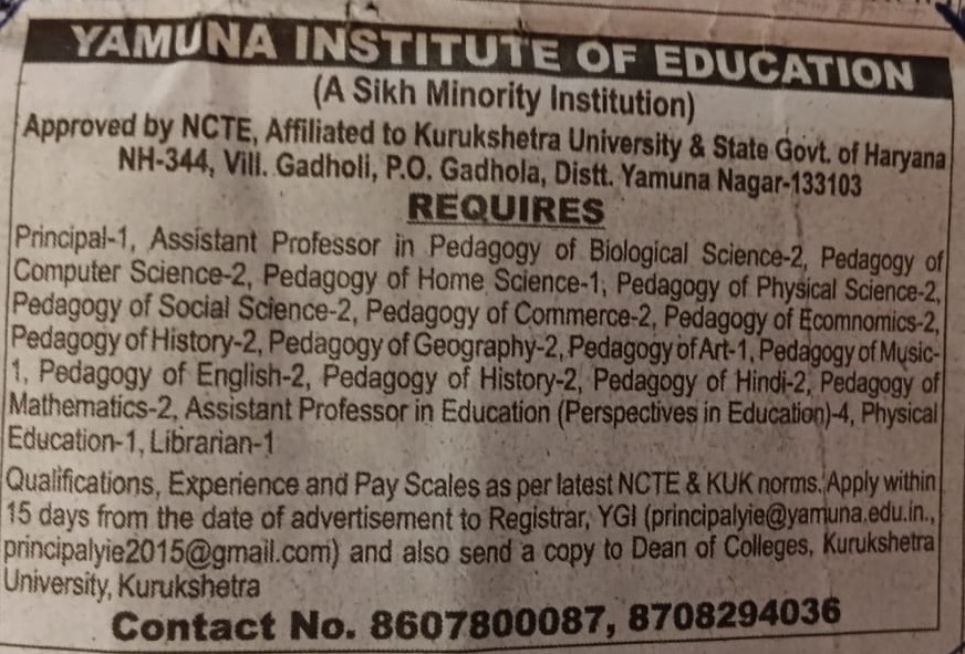 Yamuna Institute of Education (YIE) offers a two-year regular B.Ed. course approved by the National Council of Teacher Education (NCTE) &affiliated with Kurukshetra University, Kurukshetra. The college aims to play a crucial role ni ensuring sustainable development and pursuing excellence in the area of teacher education in the country. YEI is preparing professionally competent teachers who can take on the challenges of today’s changing realities in schools and meet the growing expectations of young learners, parents and society.